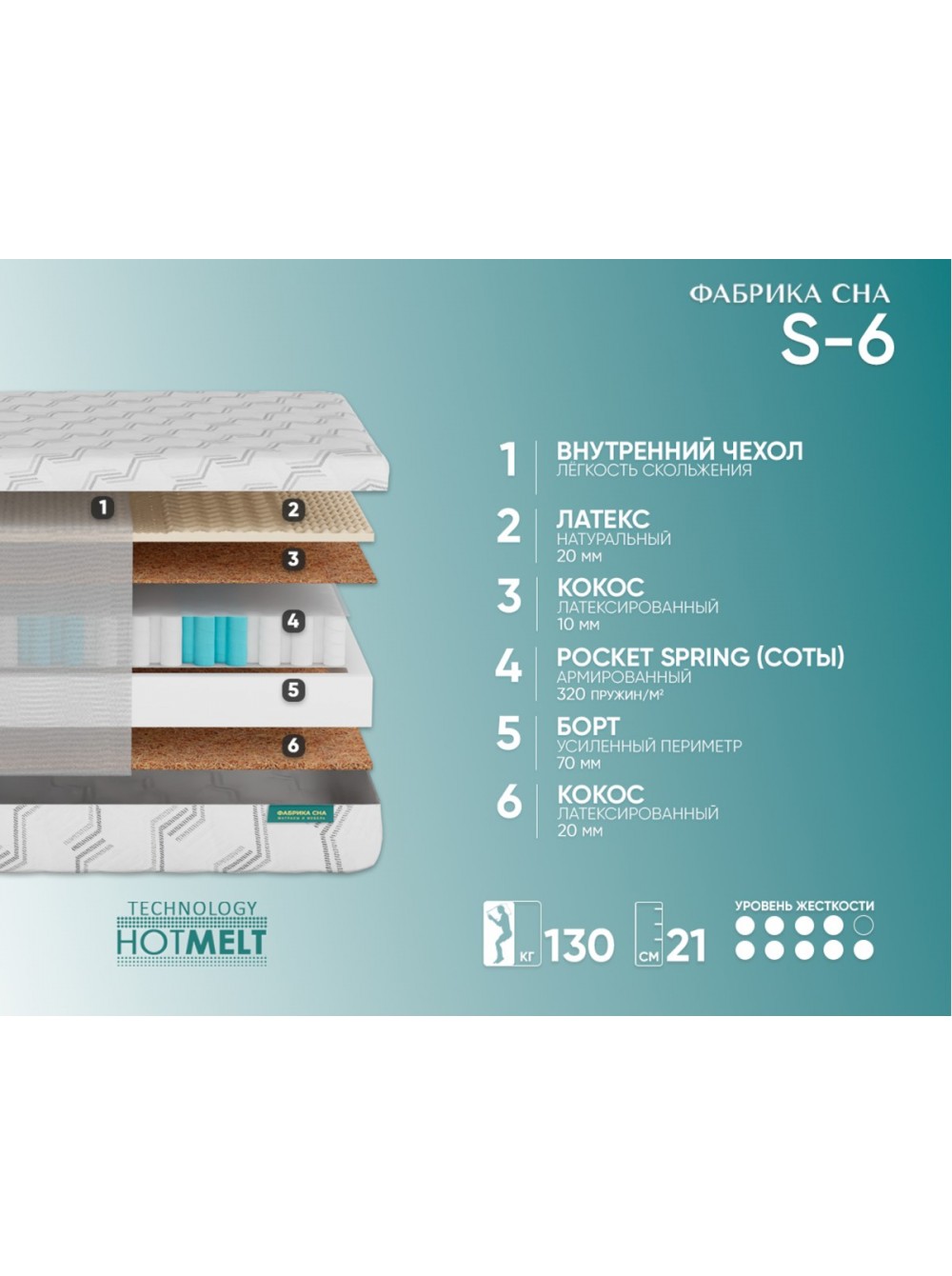 6. Пружинный блок Pocket Spring- 7 зон 14см шахматной сборки - более совершенный тип пружинного блока, каждая из пружин которого находится в отдельном чехле из нетканого полотна. Пружины работают независимо, что позволяет оптимально (точечно) распределять нагрузку тела, усиливая ортопедический эффект. Матрас обладает свойством идеально повторять контуры тела, что делает его максимально анатомическим. Благодаря точечной эластичности матраса у него отсутствует «эффект волны». Двуспальные модели такого матраса особенно подойдут для сна людям с большой разницей в весе.